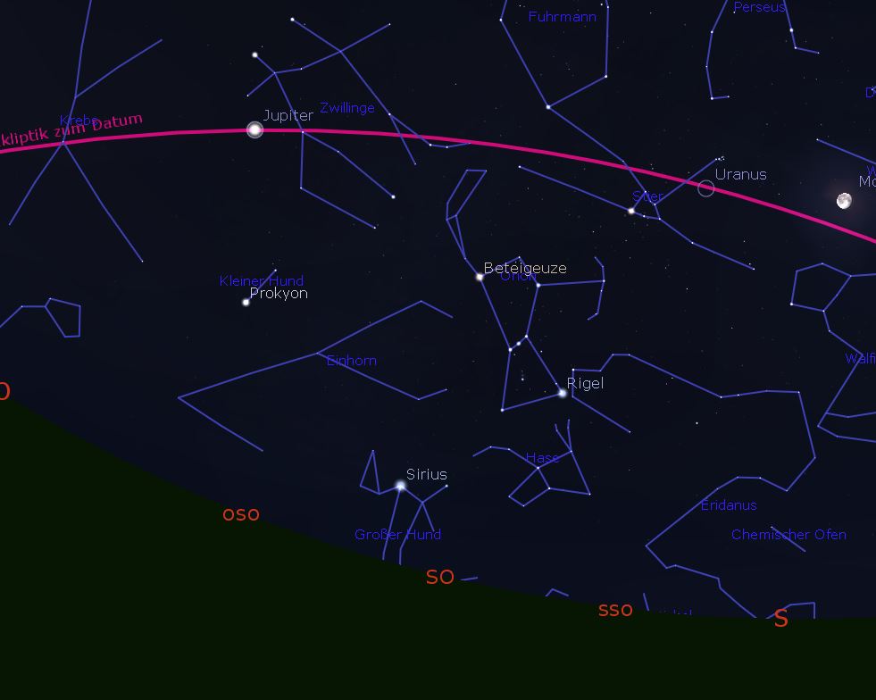 Der Mond passiert am 5. und 6. Saturn (fast Vollmond), am 13. + 14. Jupiter (abnehmender Halbmond) und am 19. + 20. Venus (abnehmende Sichel) und kann uns als Wegweiser zu den Planeten dienen.