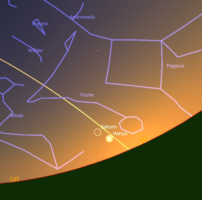 Die drei schnell laufenden Planeten Merkur, Venus und Mars stehen immer noch in Sonnennähe. Während Mars und Merkur weiterhin für uns unsichtbar bleibe, entfernt sich Venus weit genug, und ist kurz nach Sonnenuntergang am westlichen Abendhimmel zu sehen.