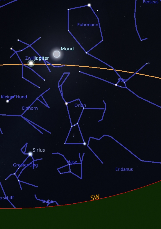 Zwischen dem 25. und 27. passiert der Halbmond Jupiter, am 20. die noch sehr schwache Mondsichel die Venus.